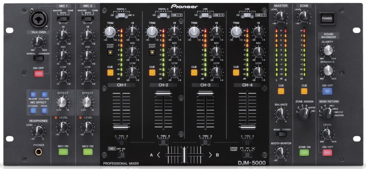 Являясь прекрасной парой для мультимедиа плеера MEP-7000, DJM-5000 предлагает цифровой звук 96кГц/24бит и широкие возможности MIDI, а на три микрофонных входа можно наложить четыре эффекта.